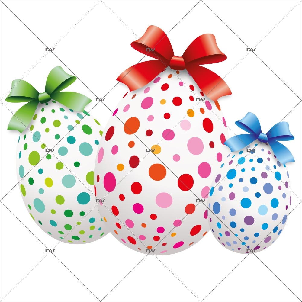 Ce trio d’œufs décorés joue la carte de la fantaisie avec ses pois multicolores et ses grands nœuds aux dégradés lumineux.